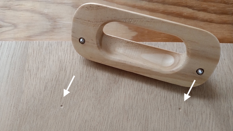 きっちり水平に並ぶように2つの穴をあけても、「取っ手側のネジ穴の位置がそもそも上下にズレている」場合、取っ手は斜めに取り付けられることになってしまいます。