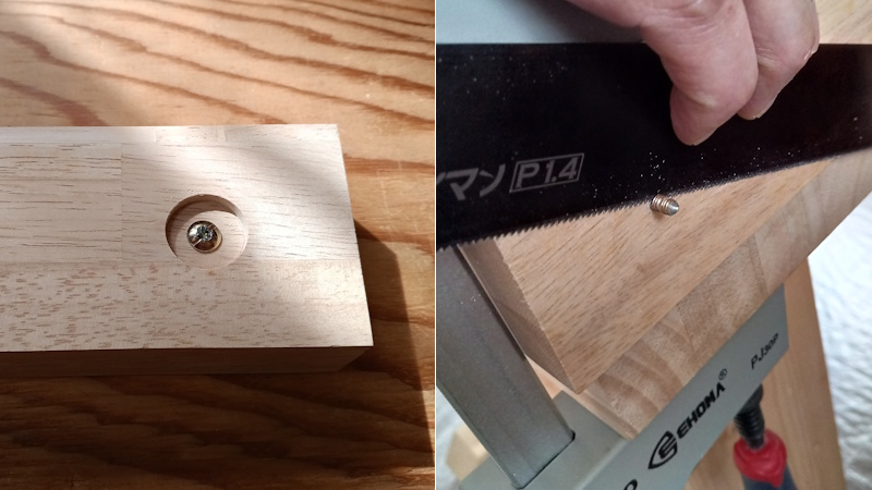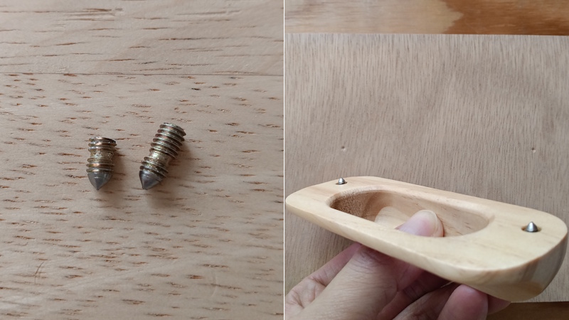 写真の例では取っ手の付属品のネジで作りましたが、径が同じであれば一般的なネジを使っても構いません。