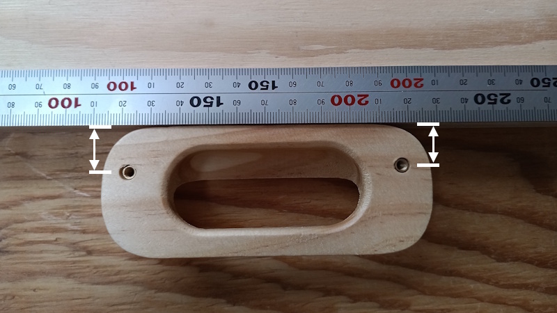 一般に、ネジ穴が2つある取っ手を取り付けるときは「取っ手の穴の間隔を測って、同じ間隔で板側に2つの穴をあける」という作業をします。しかし正確に取り付けることは意外と難しいです。